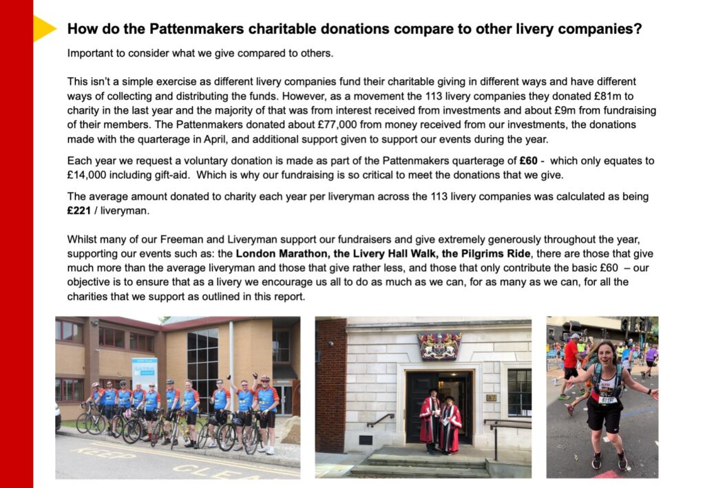 This year the Worshipful Company of Pattenmakers foundation will be donating almost a £100K to the individuals and charities that we support and that is only made possible by the money donated by our liveryman, and the fundraising that we do, such as the London Landmark Half Marathon, the London Marathon and the Pilgrims Bike ride.