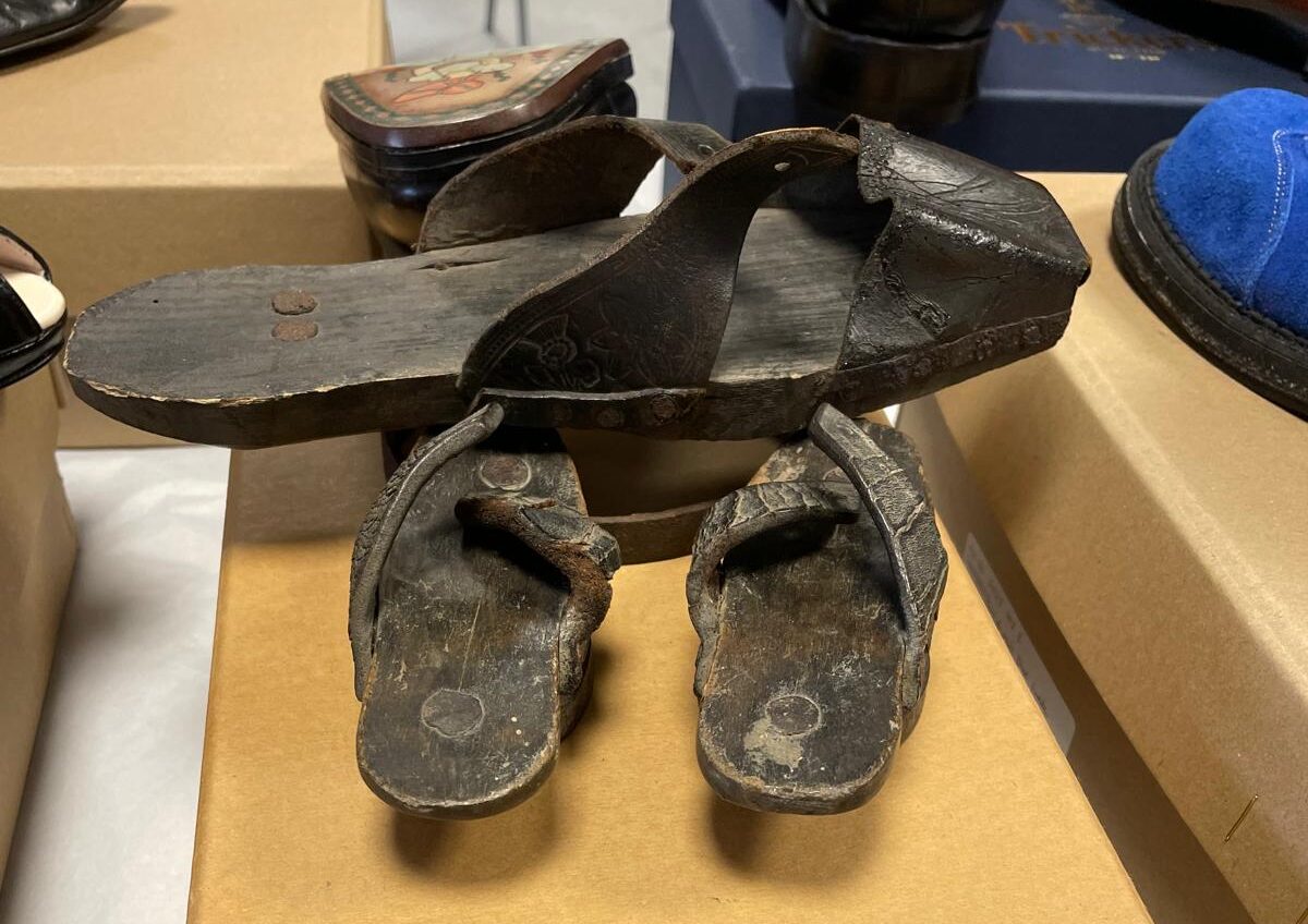 Pattens are under shoes designed to be worn outdoors and to lift the wearers and their shoes above the mud and grime of early streets.